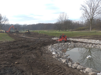 The view from what used to be #10 tee. The topsoil has been stripped and stockpiled. Soil from the project will be used to raise this area out of the floodplain. It will then be sodded with bentgrass in the fairway and tees. The rough will be seeded.