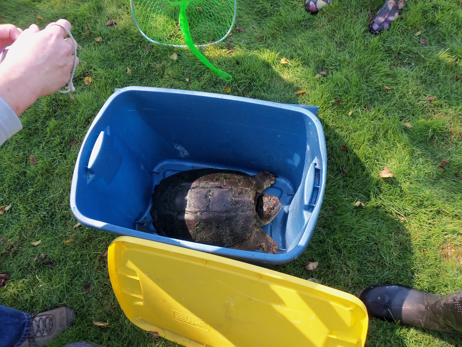 David Mifsud, City of Ann Arbor herpetologist, taking one of the snapping turtles out of the transportation tub.